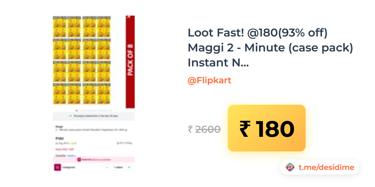 93% off on - Loot Fast! @180(93% off) Maggi 2 - Minute (case pack) Instant Noodles Vegetarian 8x845gm Flipkart Minutes Showing Gurgaon - Rs. 180