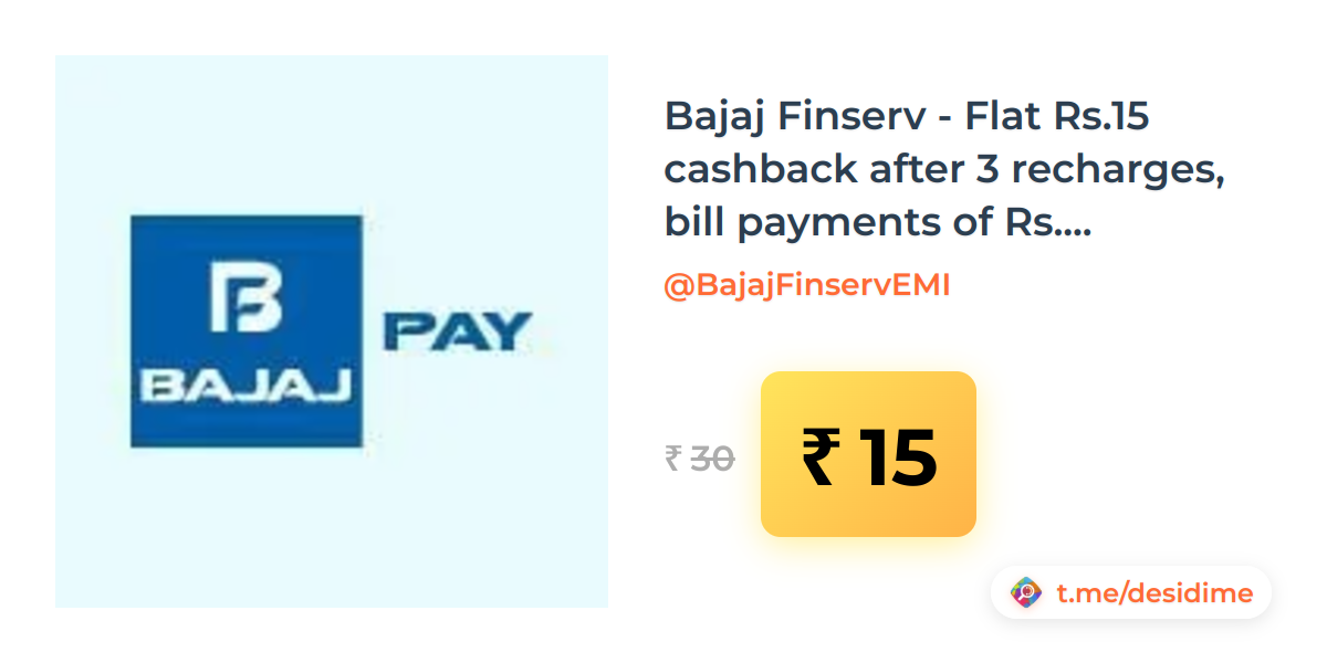 50% off on - Bajaj Finserv - Flat Rs.15 cashback after 3 recharges, bill payments of Rs.10 (7pm-9pm) - Rs. 15