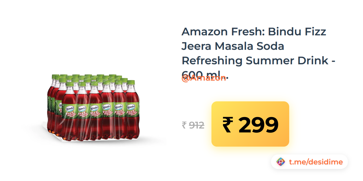 67% off on - Amazon Fresh: Bindu Fizz Jeera Masala Soda Refreshing Summer Drink - 600 ml Pet (Pack of 24) [Location Specific] - Rs. 299