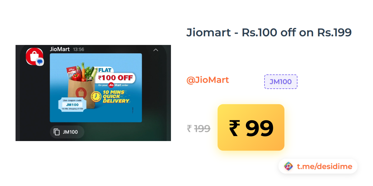 50% off on - Jiomart - Rs.100 off on Rs.199 - Rs. 99