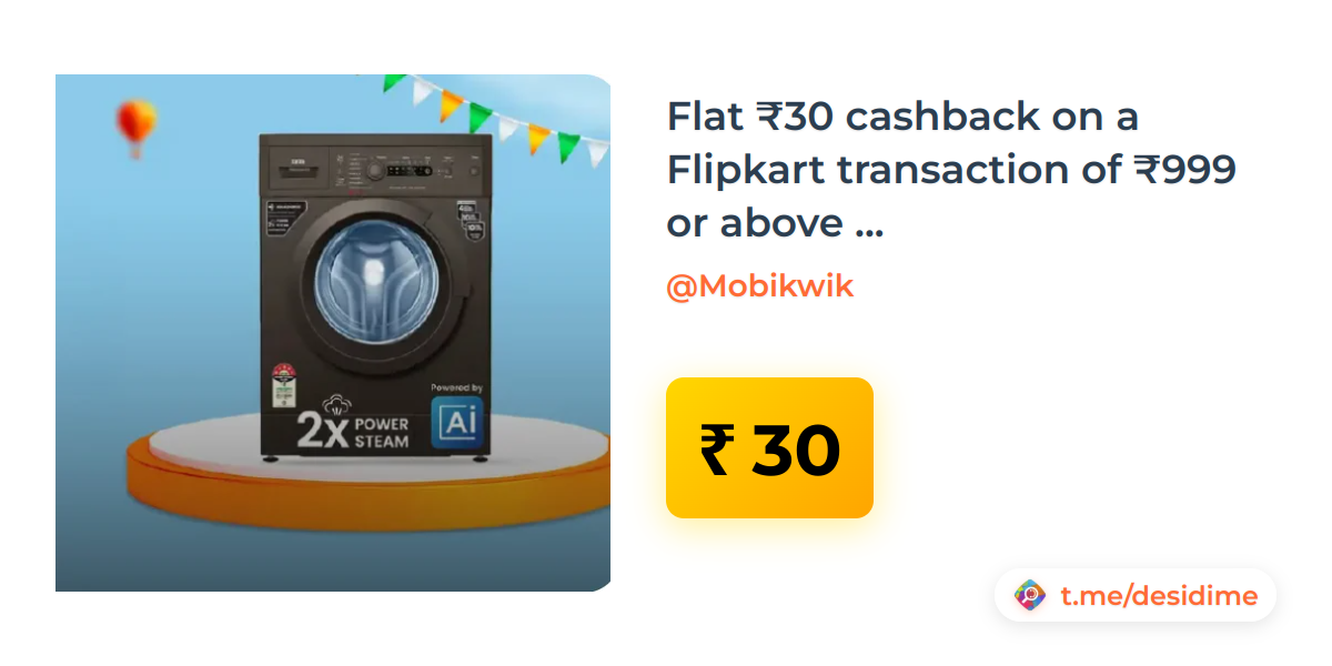 Flat ₹30 cashback on a Flipkart transaction of ₹999 or above when payment via MobiKwik UPI - Rs. 30