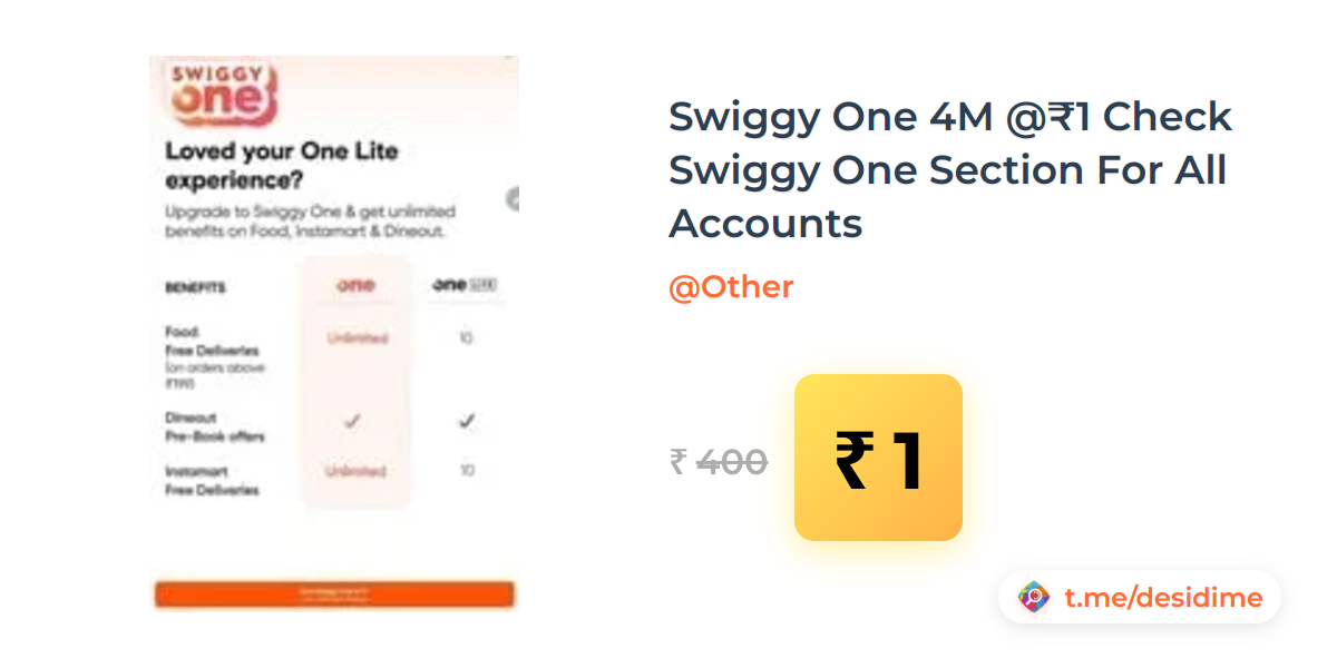 100% off on - Swiggy One 4M @₹1 Check Swiggy One Section For All Accounts - Rs. 1