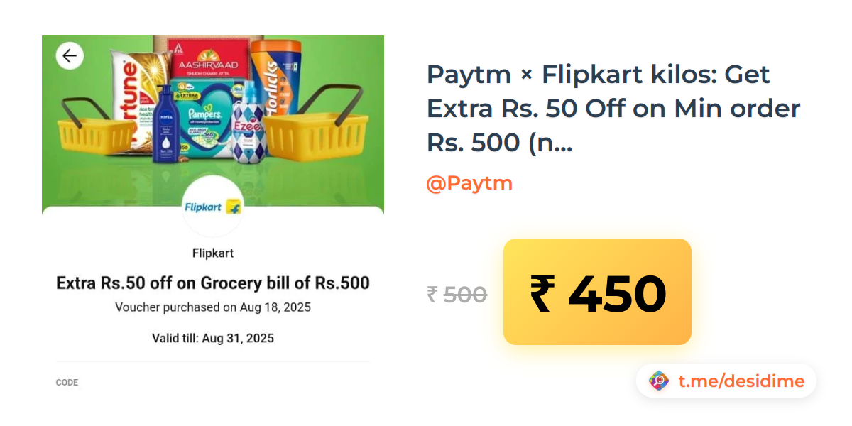 10% off on - Paytm × Flipkart kilos: Get Extra Rs. 50 Off on Min order Rs. 500 (new series, 22 digits code) - Rs. 450