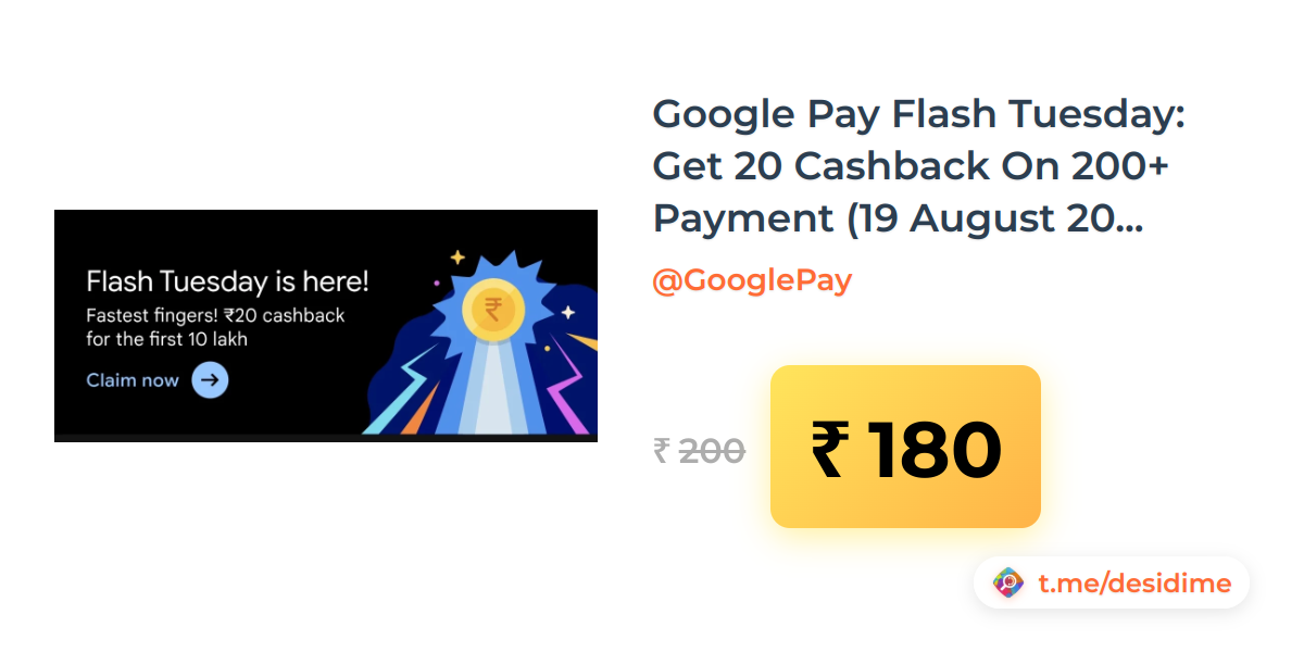 10% off on - Google Pay Flash Tuesday: Get 20 Cashback On 200+ Payment (19 August 2025) - Rs. 180