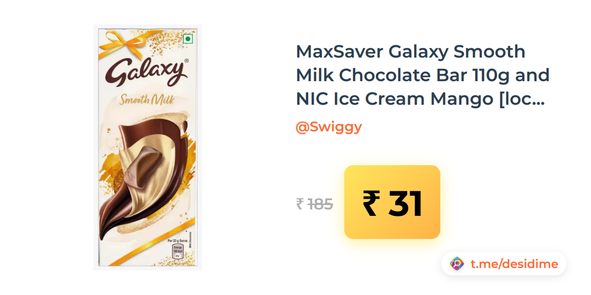 83% off on - MaxSaver Galaxy Smooth Milk Chocolate Bar 110g and NIC Ice Cream Mango [location specific] - Rs. 31