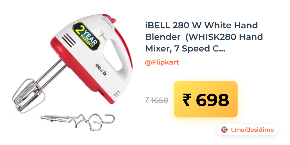 58% off on - iBELL 280 W White Hand Blender (WHISK280 Hand Mixer, 7 Speed Control Plus Turbo, Beater for Cakes, Dough Hooks) - Rs. 698