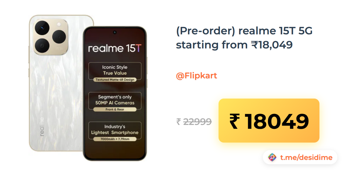 22% off on - (Pre-order) realme 15T 5G starting from ₹18,049 - Rs. 18049