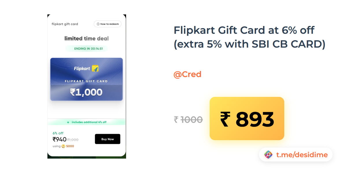 11% off on - Flipkart Gift Card at 6% off (extra 5% with SBI CB CARD) - Rs. 893