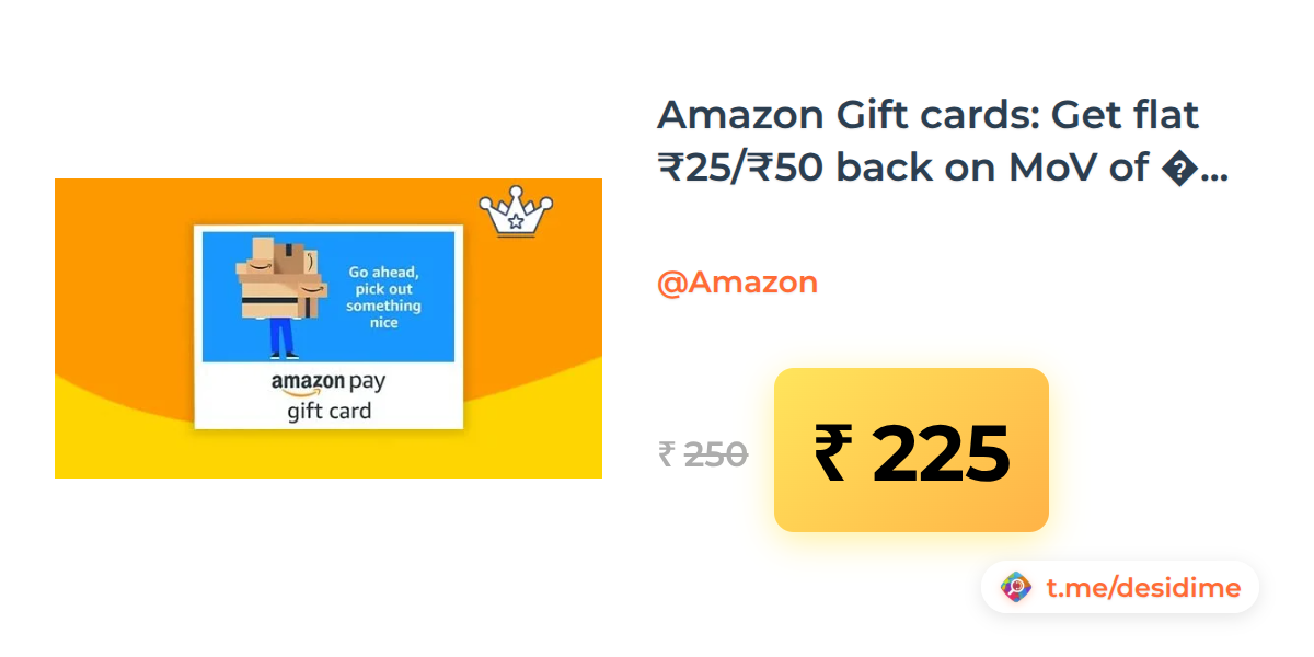 10% off on - Amazon Gift cards: Get flat ₹25/₹50 back on MoV of ₹250/500 gift cards (User specific) - Rs. 225