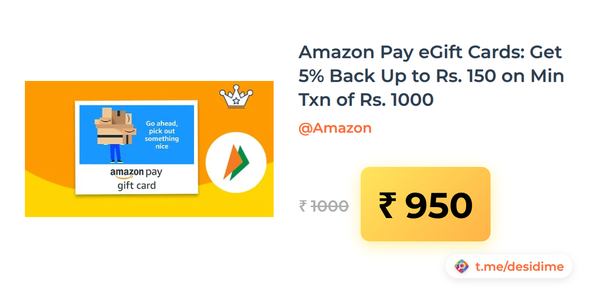 5% off on - Amazon Pay eGift Cards: Get 5% Back Up to Rs. 150 on Min Txn of Rs. 1000 - Rs. 950