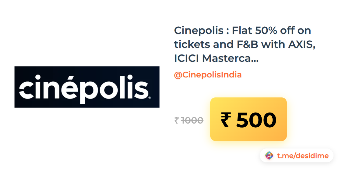 50% off on - Cinepolis : Flat 50% off on tickets and F&B with AXIS, ICICI Mastercards (only for offline) - Rs. 500