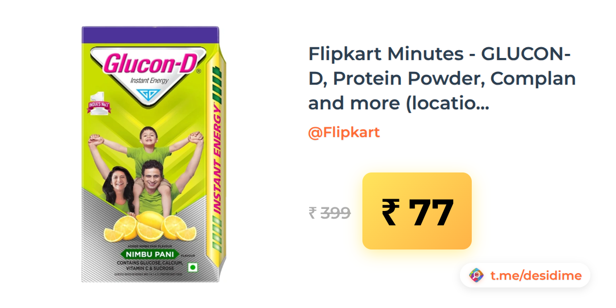 81% off on - Flipkart Minutes - GLUCON-D, Protein Powder, Complan and more (location specific) - Rs. 77