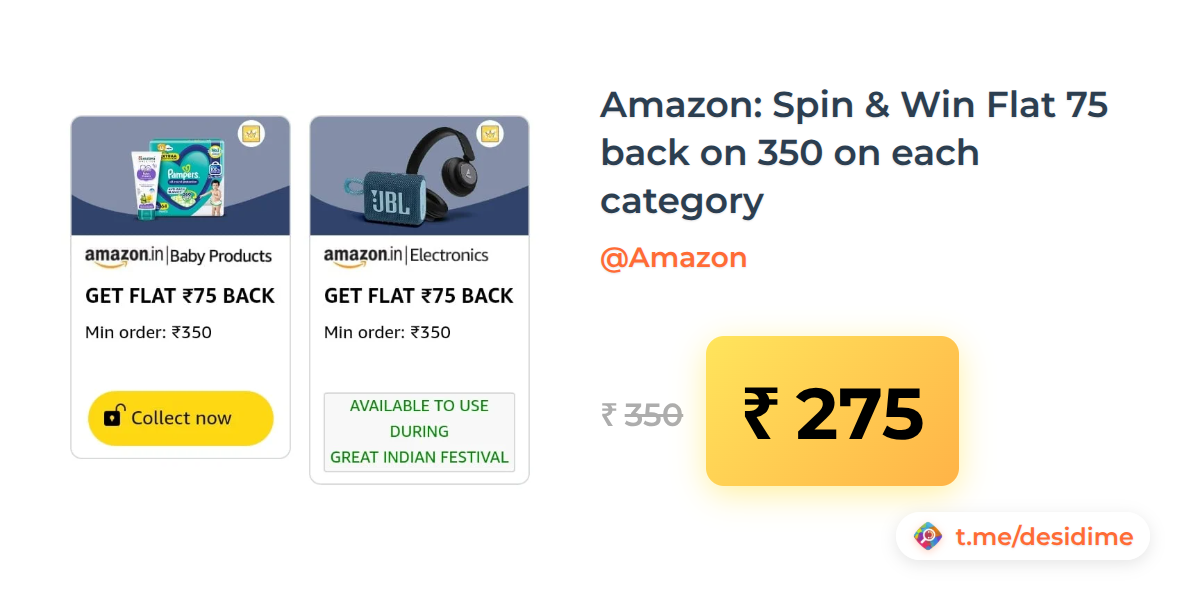 21% off on - Amazon: Spin & Win Flat 75 back on 350 on each category - Rs. 275