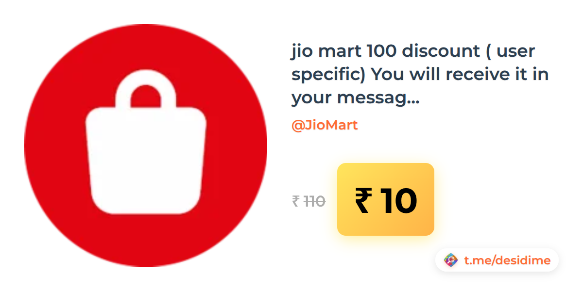 91% off on - jio mart 100 discount ( user specific) You will receive it in your message Inbox - Rs. 10