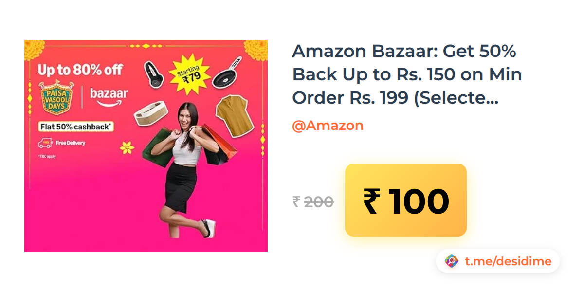 50% off on - Amazon Bazaar: Get 50% Back Up to Rs. 150 on Min Order Rs. 199 (Selected Accounts) - Rs. 100