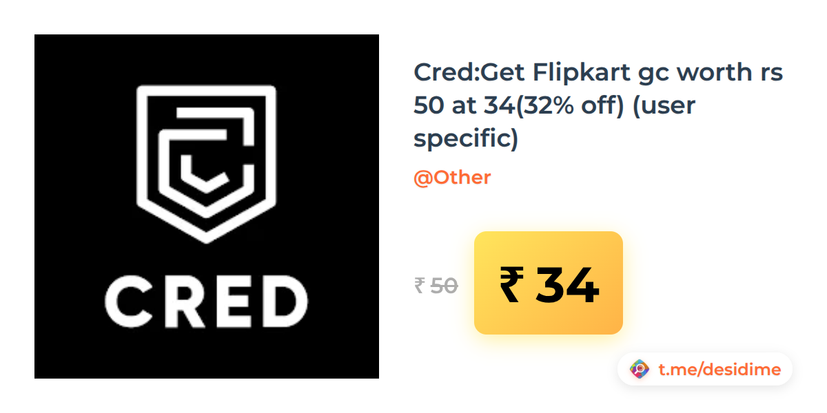 32% off on - Cred:Get Flipkart gc worth rs 50 at 34(32% off) (user specific) - Rs. 34