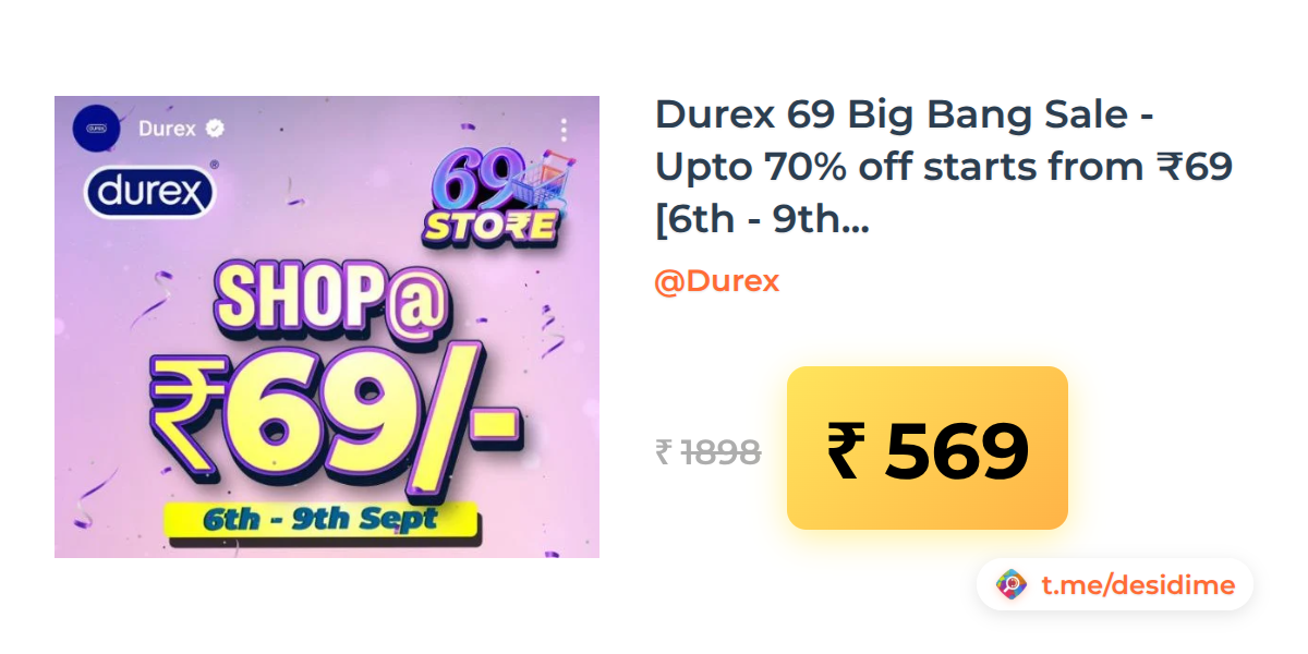 70% off on - Durex 69 Big Bang Sale - Upto 70% off starts from ₹69 [6th - 9th Sept] - Rs. 569