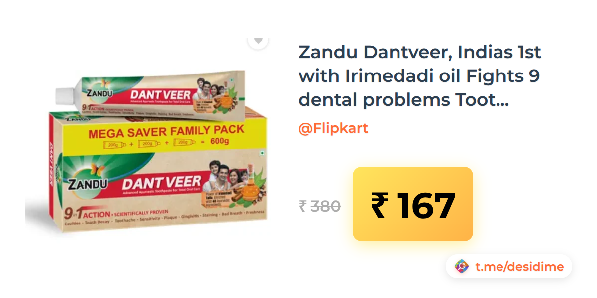 56% off on - Zandu Dantveer, Indias 1st with Irimedadi oil Fights 9 dental problems Toothpaste (600 g) - Rs. 167