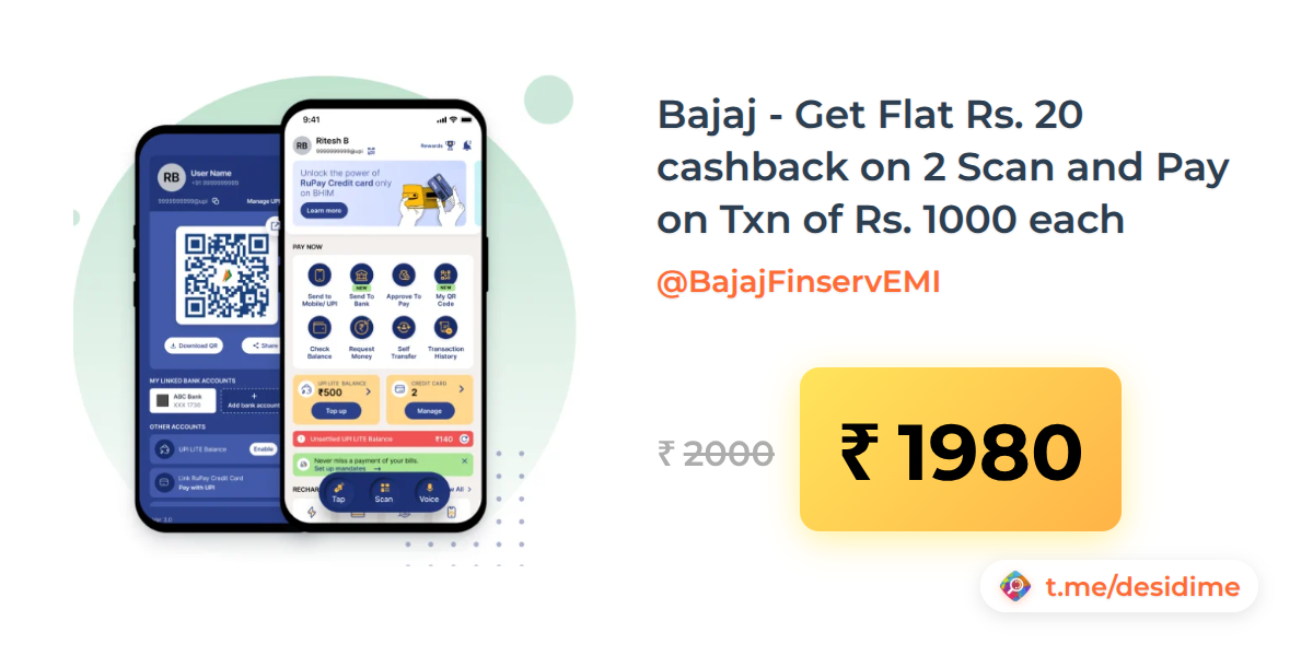 1% off on - Bajaj - Get Flat Rs. 20 cashback on 2 Scan and Pay on Txn of Rs. 1000 each - Rs. 1980