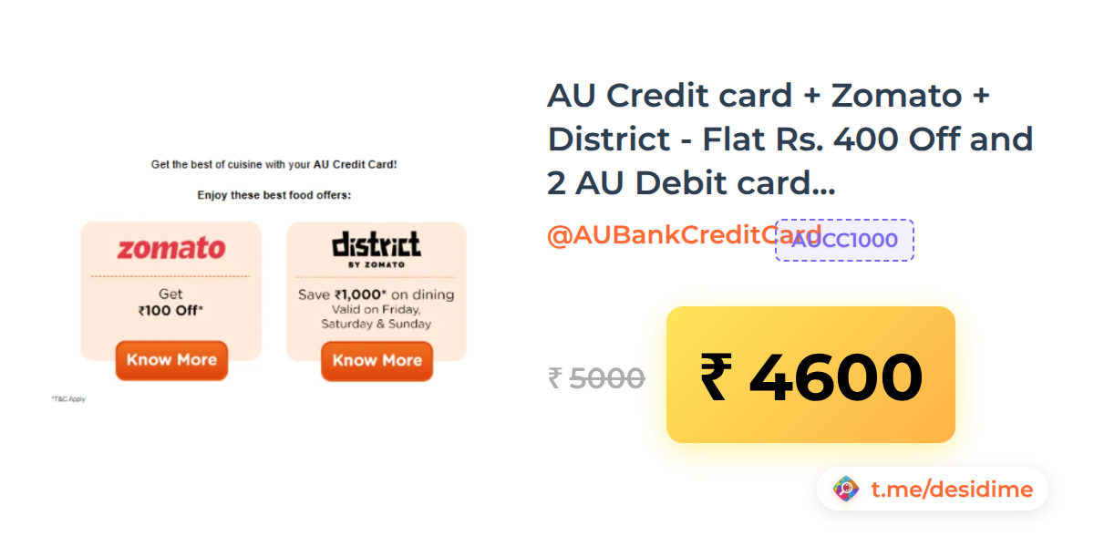 8% off on - AU Credit card + Zomato + District - Flat Rs. 400 Off and 2 AU Debit card 10% offers - Rs. 4600