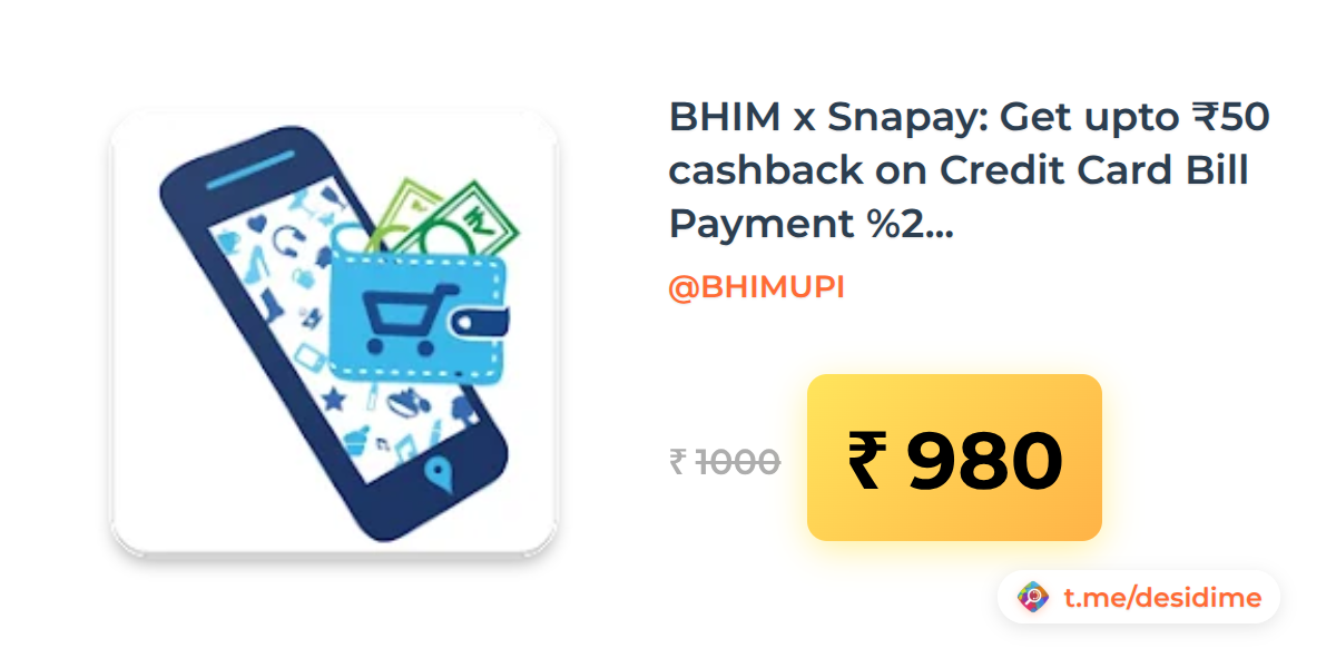 2% off on - BHIM x Snapay: Get upto ₹50 cashback on Credit Card Bill Payment (atleast ₹10, Twice per user) - Rs. 980