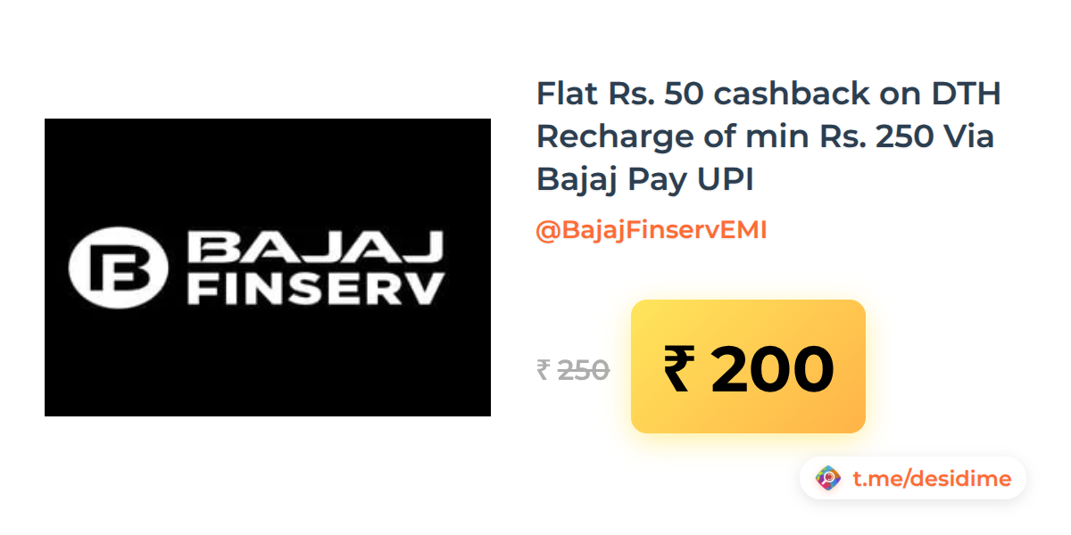 20% off on - Flat Rs. 50 cashback on DTH Recharge of min Rs. 250 Via Bajaj Pay UPI - Rs. 200