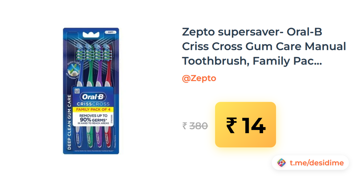 96% off on - Zepto supersaver- Oral-B Criss Cross Gum Care Manual Toothbrush, Family Pack Toothbrushes, Soft, For Adults - Rs. 14