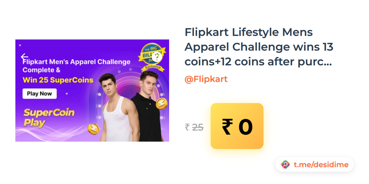 100% off on - Flipkart Lifestyle Mens Apparel Challenge wins 13 coins+12 coins after purchase 3 men apparel [Total 25 Coins] - Rs. 0