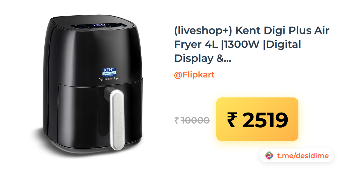 75% off on - (liveshop+) Kent Digi Plus Air Fryer 4L |1300W |Digital Display & Touch Control Panel | Black Air Fryer - Rs. 2519