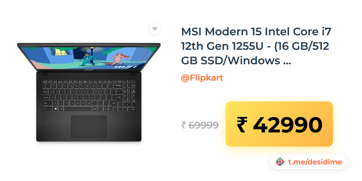 39% off on - MSI Modern 15 Intel Core i7 12th Gen 1255U - (16 GB/512 GB SSD/Windows 11 Home) With MS Office) - Rs. 42990