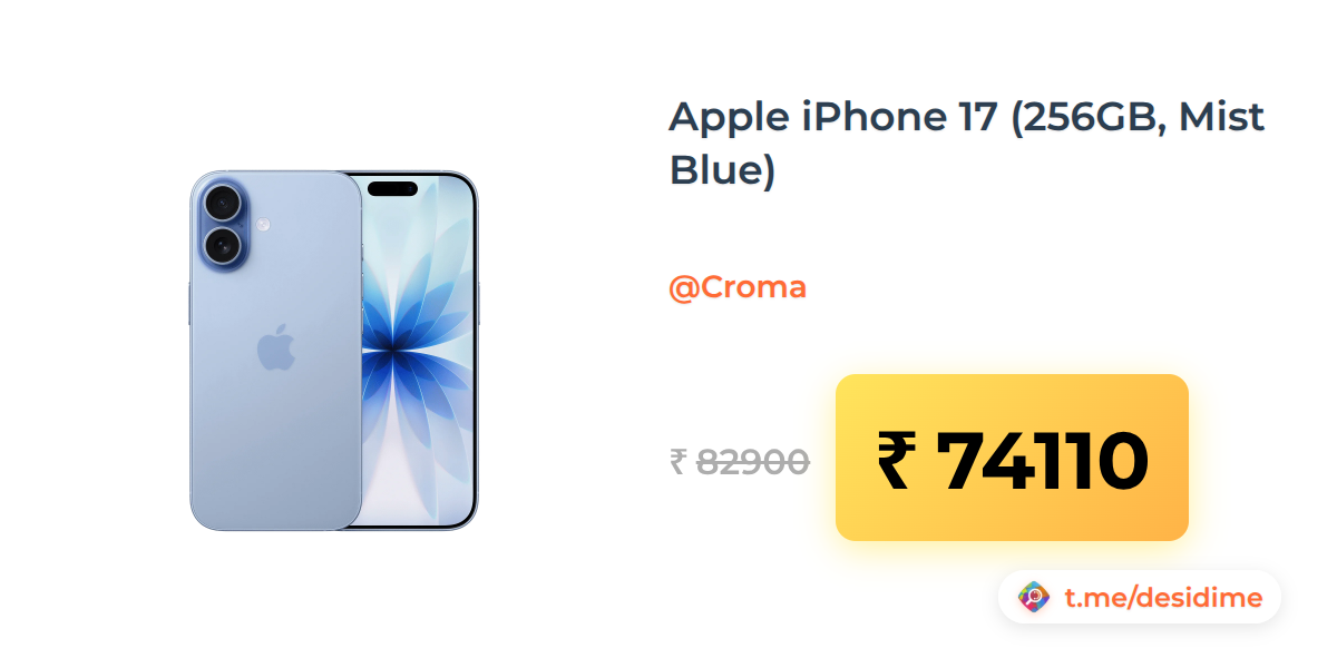 11% off on - Apple iPhone 17 (256GB, Mist Blue) - Rs. 74110