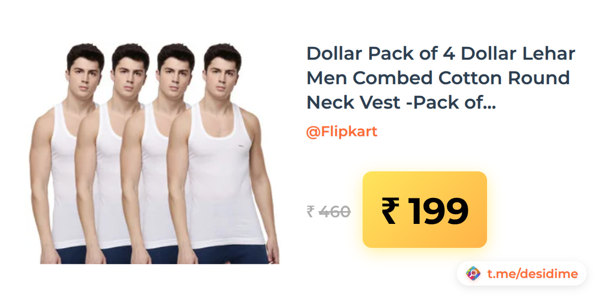 57% off on - Dollar Pack of 4 Dollar Lehar Men Combed Cotton Round Neck Vest -Pack of 4- White Men Vest - Rs. 199