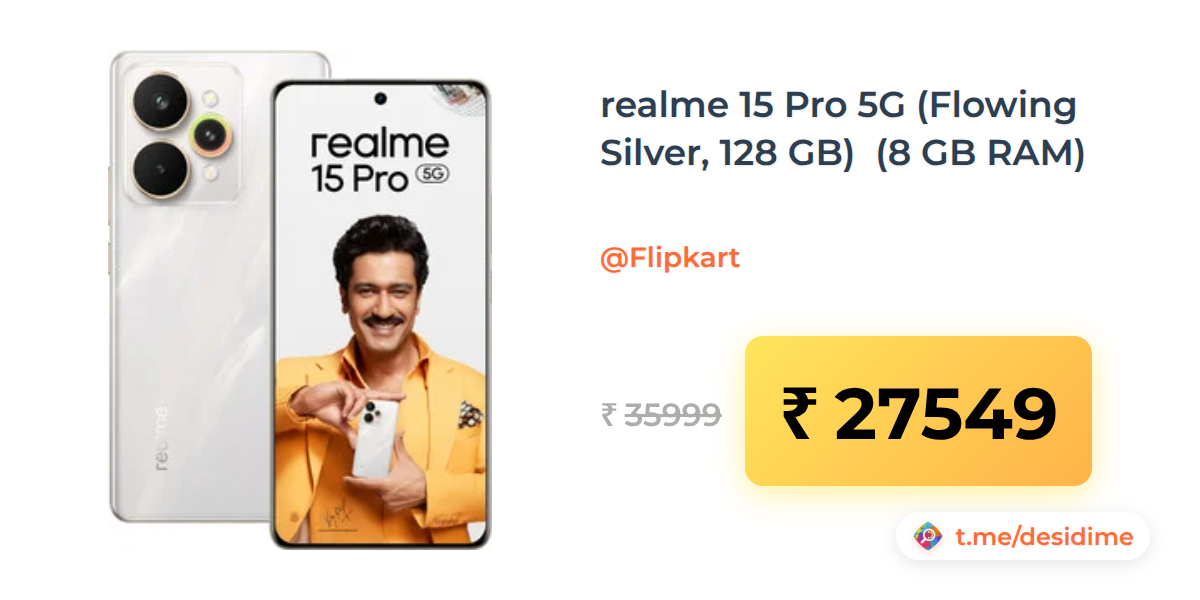 23% off on - realme 15 Pro 5G (Flowing Silver, 128 GB)  (8 GB RAM) - Rs. 27549
