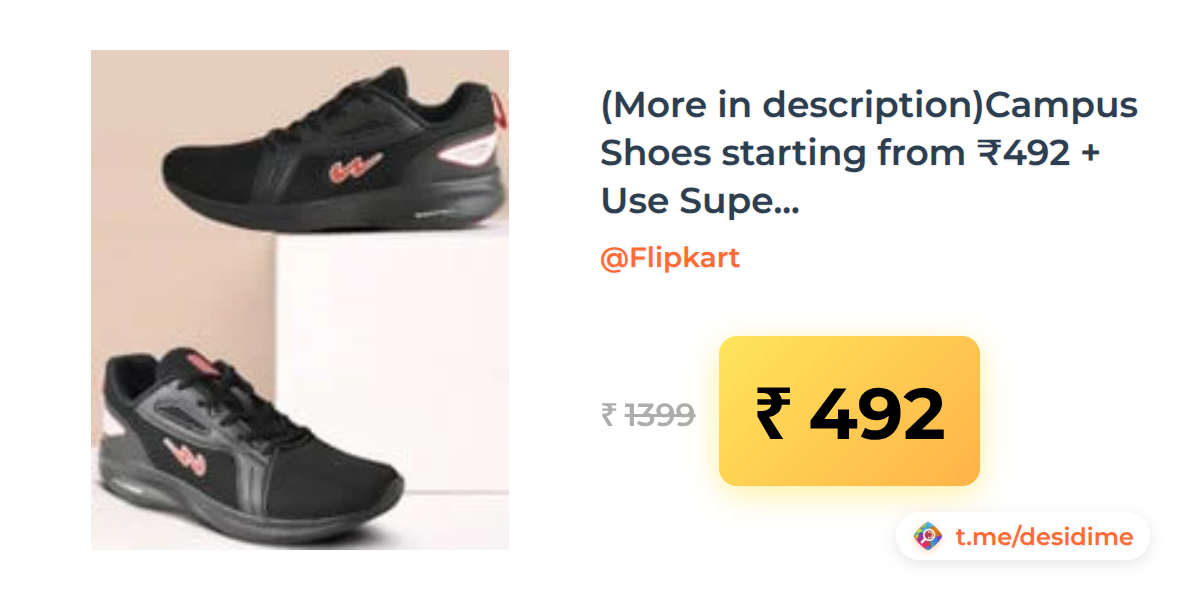 65% off on - (More in description)Campus Shoes starting from ₹492 + Use SuperCoins for extra discount - Rs. 492