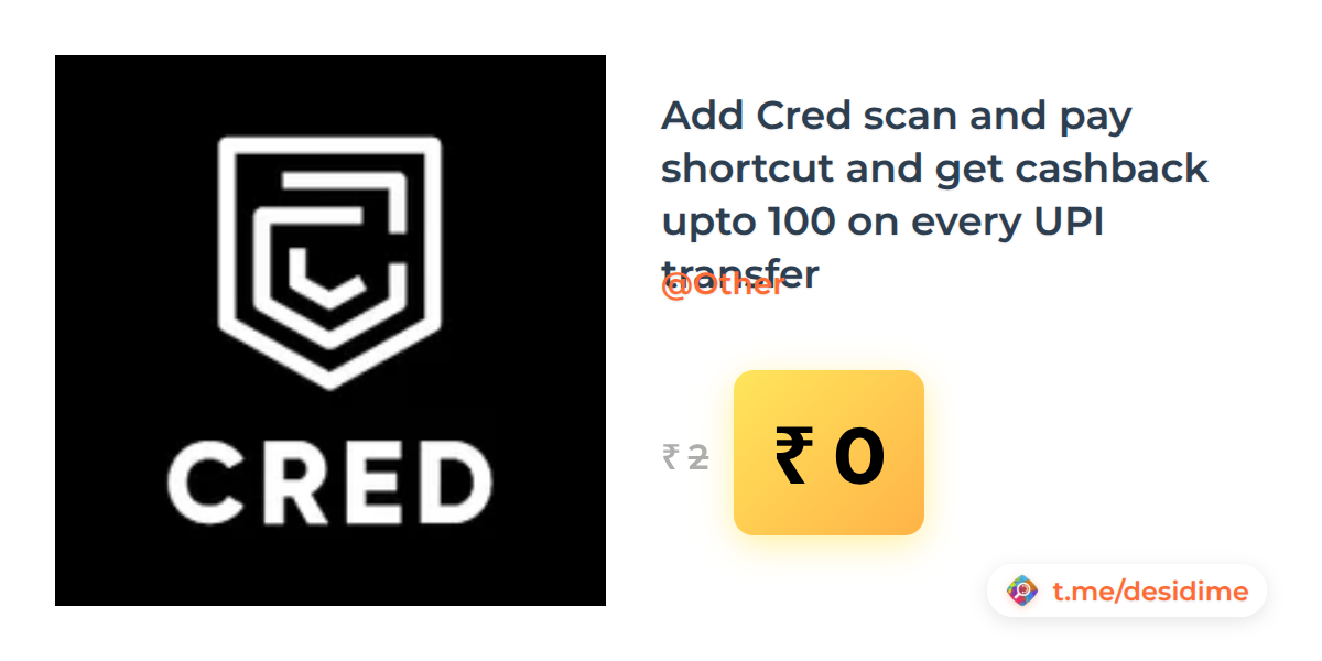 100% off on - Add Cred scan and pay shortcut and get cashback upto 100 on every UPI transfer - Rs. 0