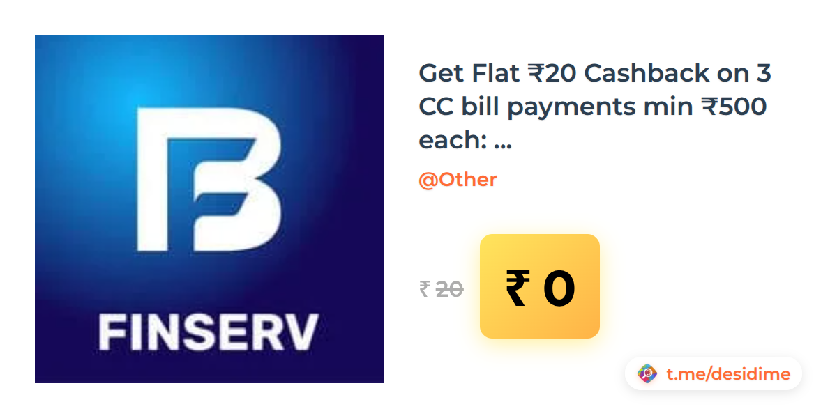 100% off on - Get Flat ₹20 Cashback on 3 CC bill payments min ₹500 each: Bajaj Finserv (4PM - 7PM) - Rs. 0