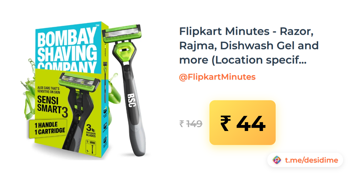 70% off on - Flipkart Minutes - Razor, Rajma, Dishwash Gel and more (Location specific) - Rs. 44