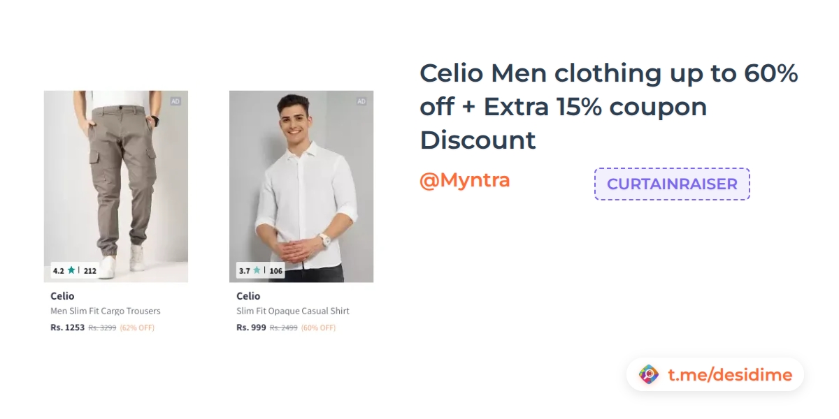 Celio Men clothing up to 60% off + Extra 15% coupon Discount
