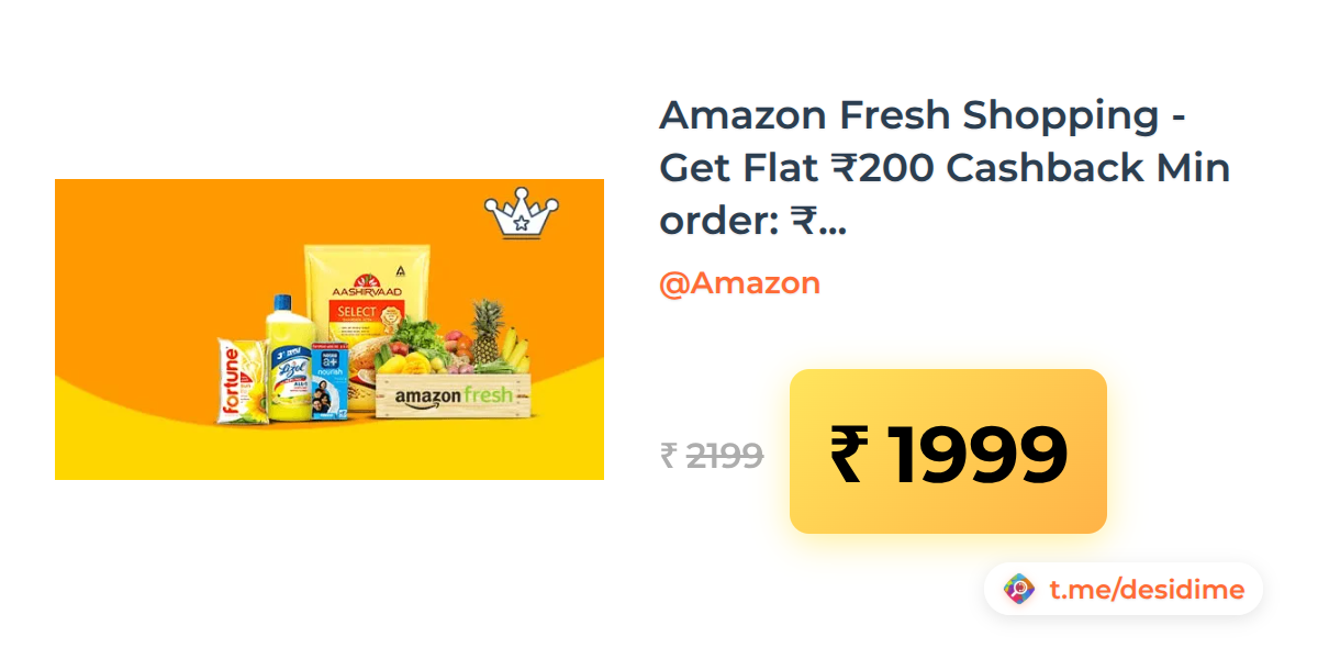 9% off on - Amazon Fresh Shopping - Get Flat βΉ200 Cashback Min order: βΉ2199 - Rs. 1999