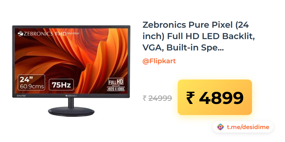 80% off on - Zebronics Pure Pixel (24 inch) Full HD LED Backlit, VGA, Built-in Speakers, Slim Design Monitor (ZEB-PA124) (75 Hz Refresh Rate) - Rs. 4899