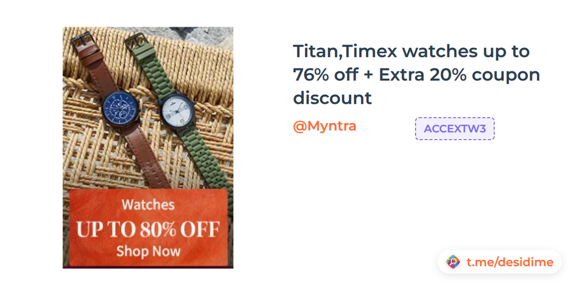 Titan,Timex watches up to 76% off + Extra 20% coupon discount