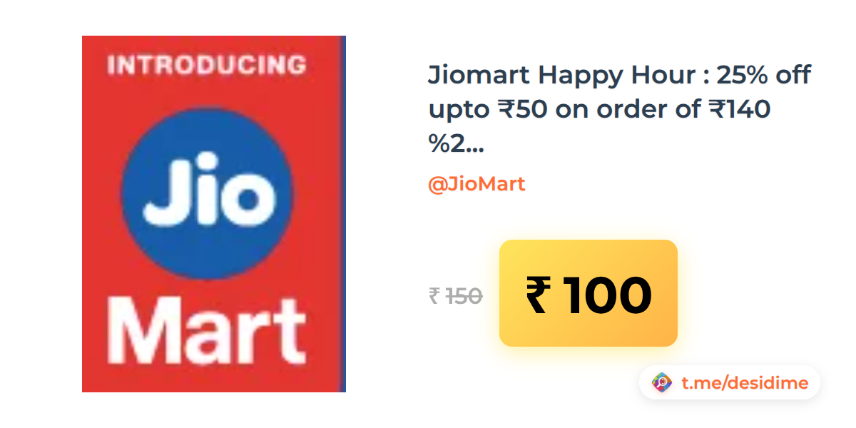 33% off on - Jiomart Happy Hour : 25% off upto ₹50 on order of ₹140 (get ₹50 off on ₹150 also) - Rs. 100