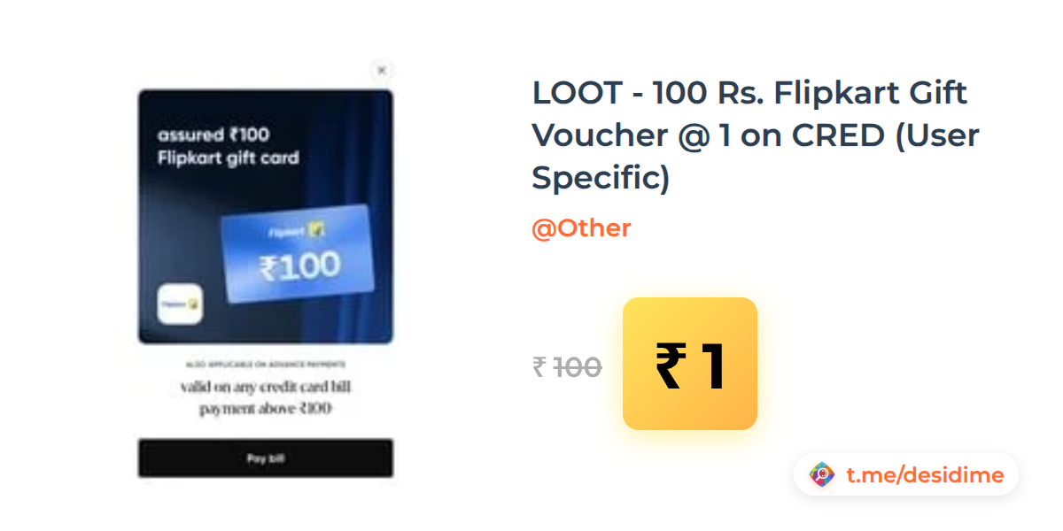 99% off on - LOOT - 100 Rs. Flipkart Gift Voucher @ 1 on CRED (User Specific) - Rs. 1