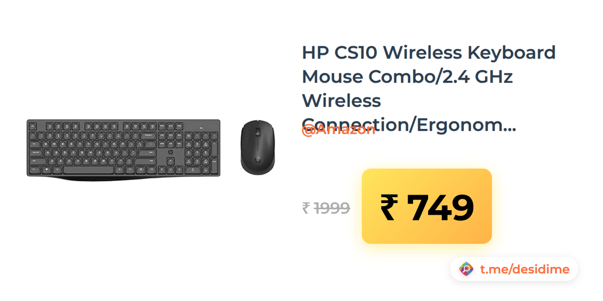 63% off on - HP CS10 Wireless Keyboard Mouse Combo/2.4 GHz Wireless Connection/Ergonomic Design/Energy and Electricity Saving/Plug and Play, Intelligent Dormancy/Drop Key Cap/ 1600 dpi/Black (7YA13PA) - Rs. 749