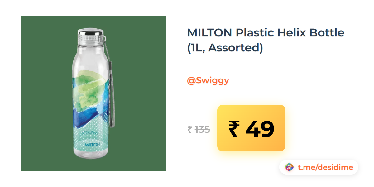 64% off on - MILTON Plastic Helix Bottle (1L, Assorted) - Rs. 49