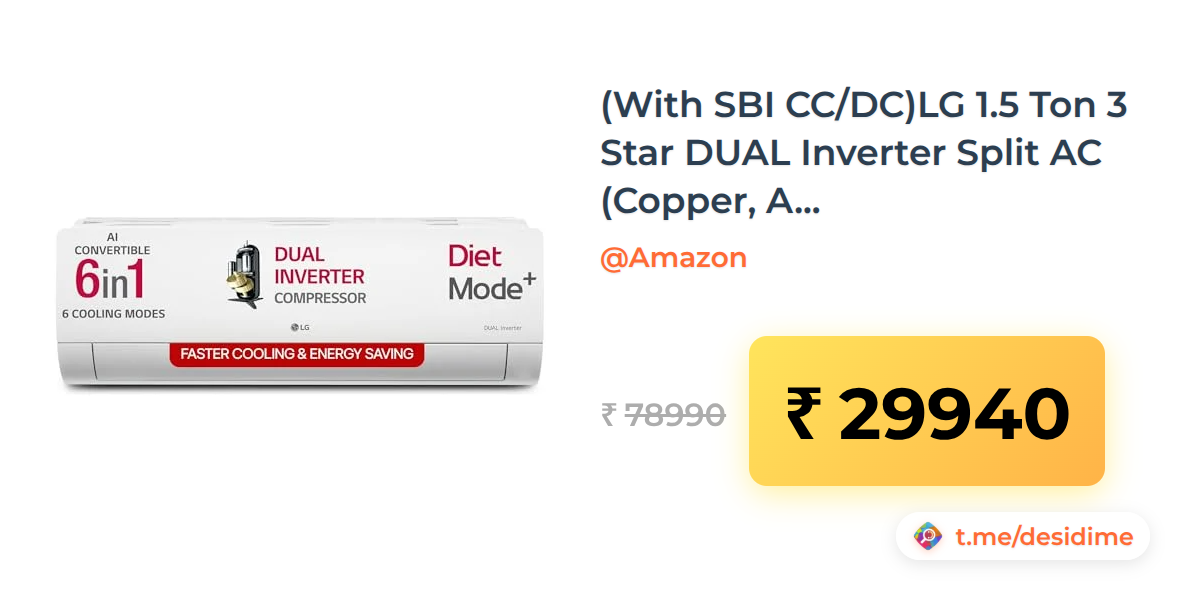 62% off on - LG 1.5 Ton 3 Star DUAL Inverter Split AC (Copper, AI Convertible 6-in-1, White) - Rs. 29940