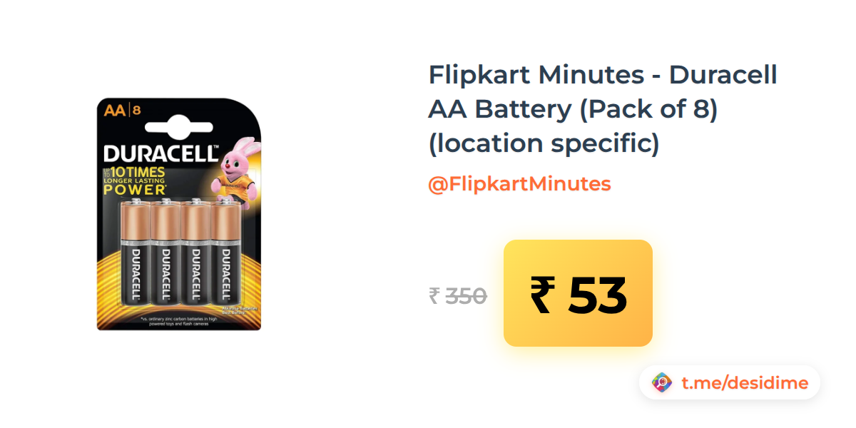 85% off on - Flipkart Minutes - Duracell AA Battery (Pack of 8) (location specific) - Rs. 53
