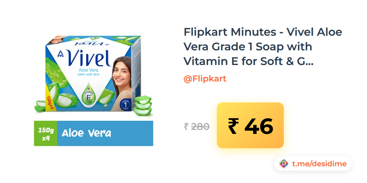 84% off on - Flipkart Minutes - Vivel Aloe Vera Grade 1 Soap with Vitamin E for Soft & Glowing Skin, for Women & Men (4 x 150 g)(location specific) - Rs. 46