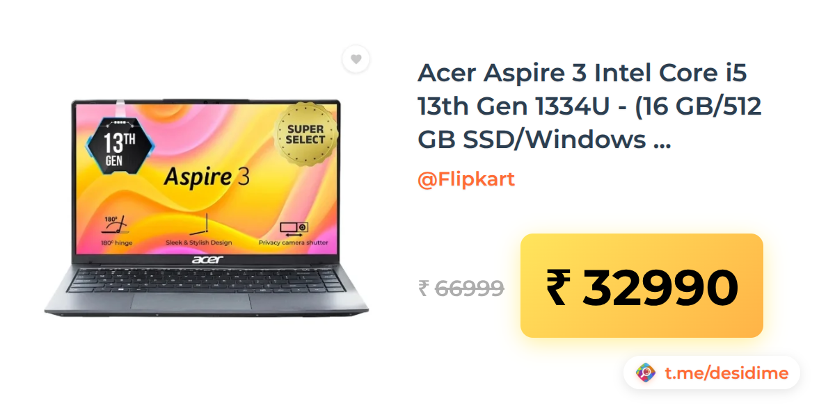 51% off on - Acer Aspire 3 Intel Core i5 13th Gen 1334U - (16 GB/512 GB SSD/Windows 11 Home (14 Inch, Steel Gray, 1.45 Kg) - Rs. 32990