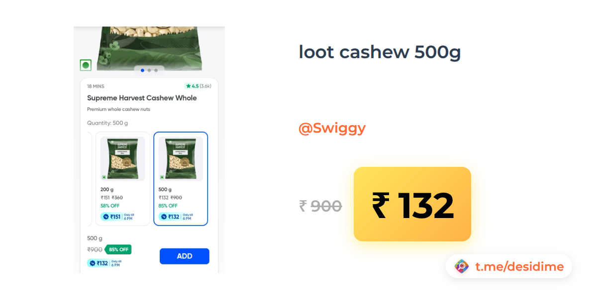 85% off on - loot cashew 500g - Rs. 132